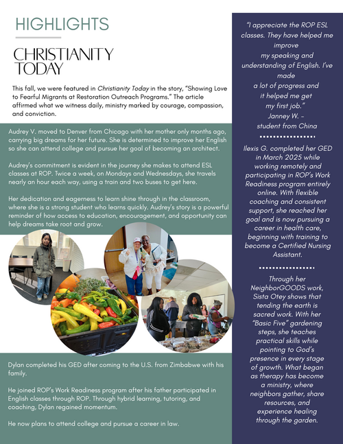 At Restoration Outreach Programs (ROP), we provide a variety of resources to strengthen our community along East Colfax in Denver, Colorado. We share Christ's love with everyone, offering a helping hand to people who may be new to our country, are facing challenging circumstances, or simply live close by and would like to deepen their faith.
